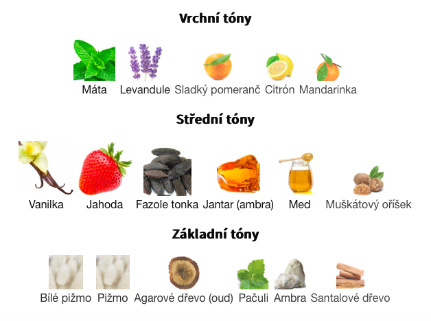 Vrchní tóny jsou Máta, Levandule, Sladký pomeranč, Citrón a Mandarinka