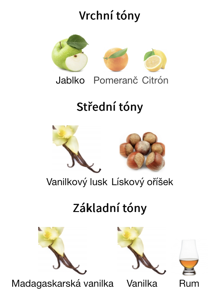 Vrchní tóny jsou Jablko, Pomeranč a Citrón