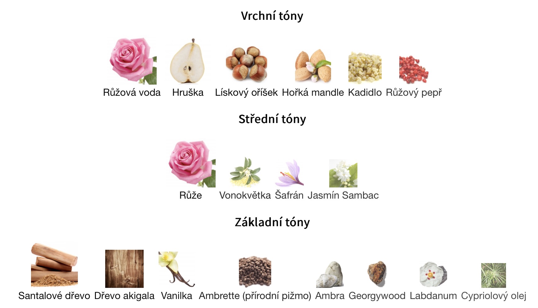 Střední tóny jsouRůže, Vonokvětka, Šafrán a Jasmín Sambac ;