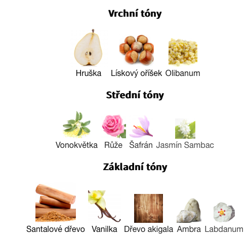 Základní tóny jsou Santalové dřevo, Vanilka, Dřevo akigala, Ambra a Labdanum.