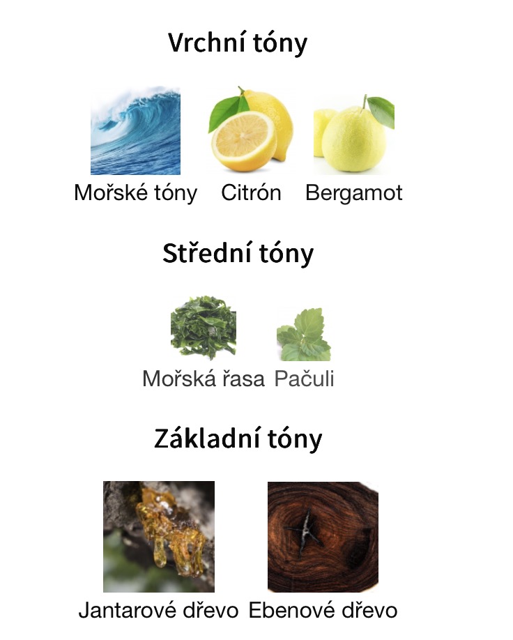 Vrchní tóny jsou Mořské tóny, Citrón a Bergamot;