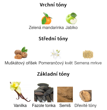 Základní tóny jsou Vanilka, Fazole tonka, Semiš a Dřevité tóny.