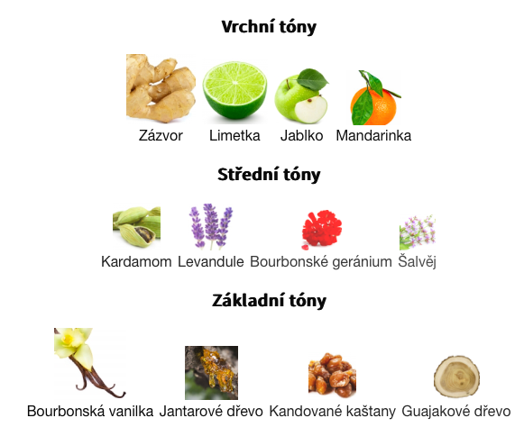 Střední tóny jsou Kardamom, Levandule, Bourbonské geránium a Šalvěj ;