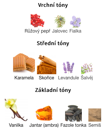 Základní tóny jsou Vanilka, Jantar (ambra), Fazole tonka a Semiš.