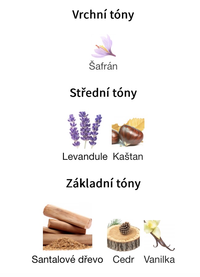 Střední tóny jsou Levandule a Kaštan ; Základní tóny jsou Santalové dřevo, Cedr a Vanilka.