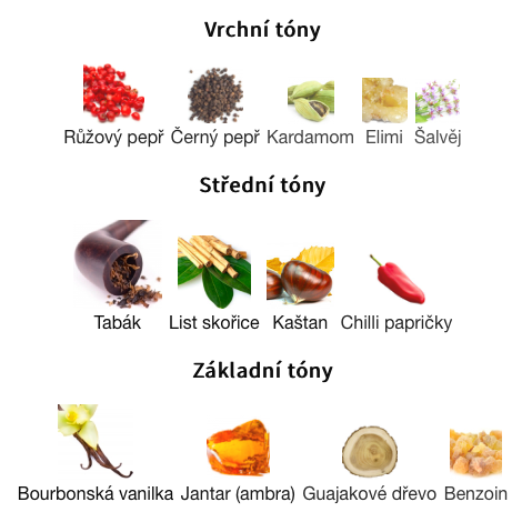 Základní tóny jsou Bourbonská vanilka, Jantar (ambra), Guajakové dřevo a Benzoin.