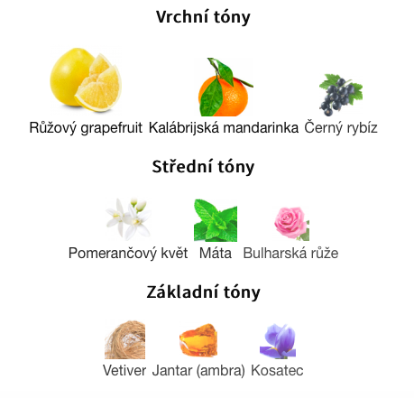 Vrchní tóny jsou:Růžový grapefruit, Kalábrijská mandarinka a Černý rybíz