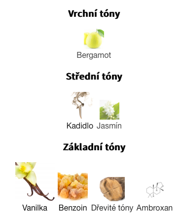 Základní tóny jsou Vanilka, Benzoin, Dřevité tóny a Ambroxan.