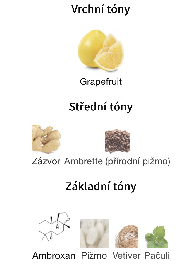 Základní tóny jsou Ambroxan, Pižmo, Vetiver a Pačuli.