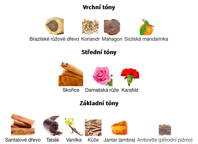 Základní tóny jsou Santalové dřevo, Tabák, Vanilka, Kůže, Jantar (ambra) a Ambrette (přírodní pižmo).