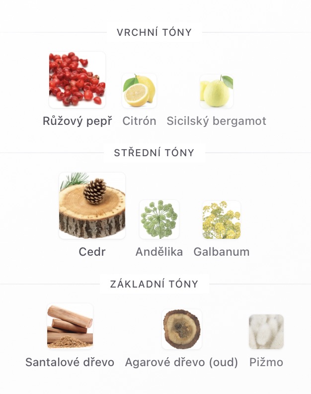 Vrchní tóny jsou Růžový pepř, Citrón a Sicilský bergamot;