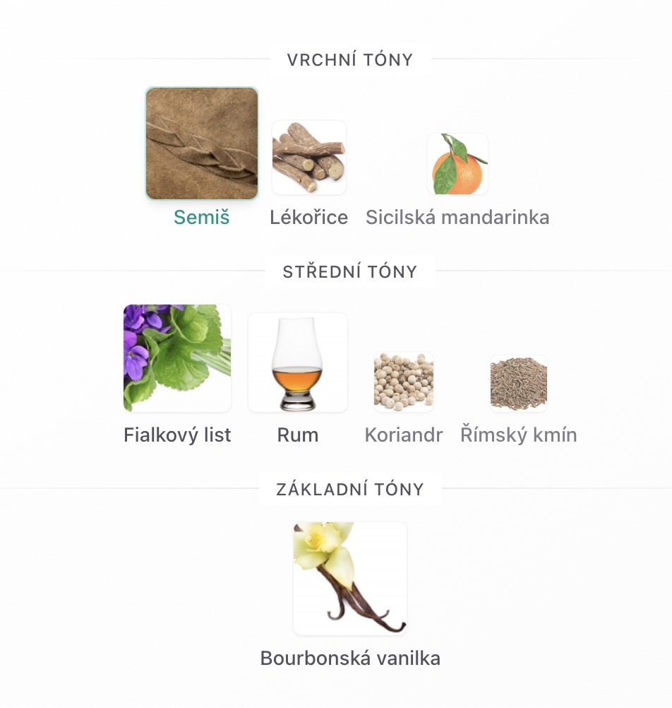 Vrchní tóny jsou Semiš, Lékořice a Sicilská mandarinka;