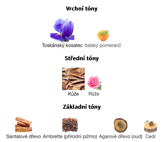 Základní tóny jsou Santalové dřevo, Ambrette (přírodní pižmo), Agarové dřevo (oud) a Cedr.