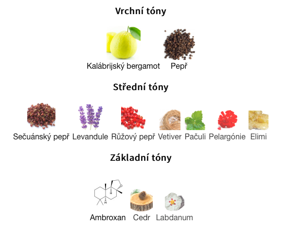 Střední tóny jsou Sečuánský pepř, Levandule, Růžový pepř, Vetiver, Pačuli, Pelargónie a Elimi