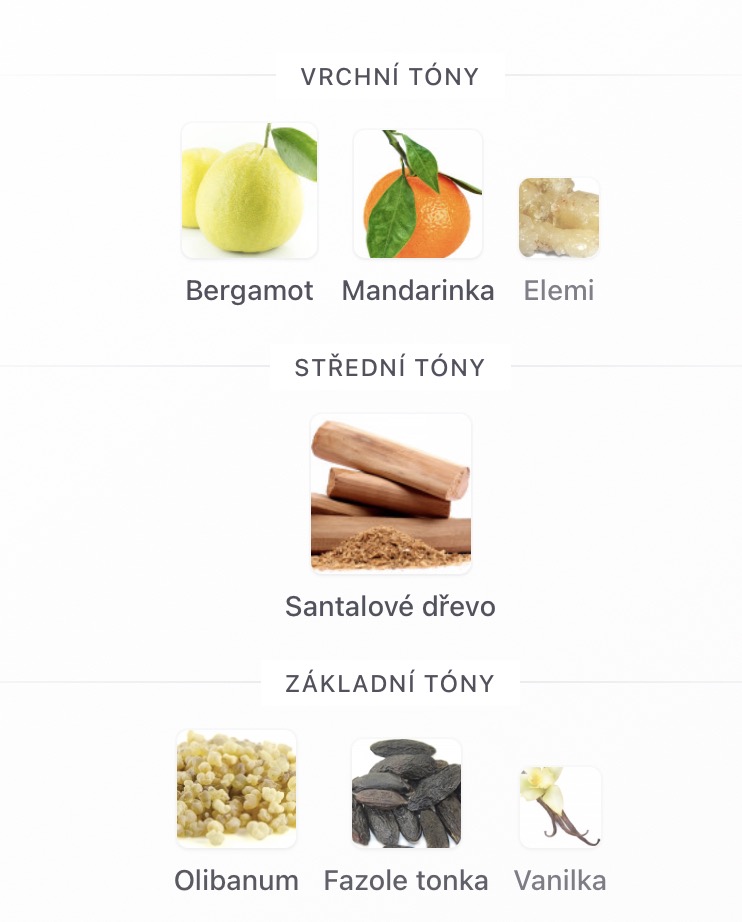 Vrchní tóny jsou Bergamot, Mandarinka a Elemi;