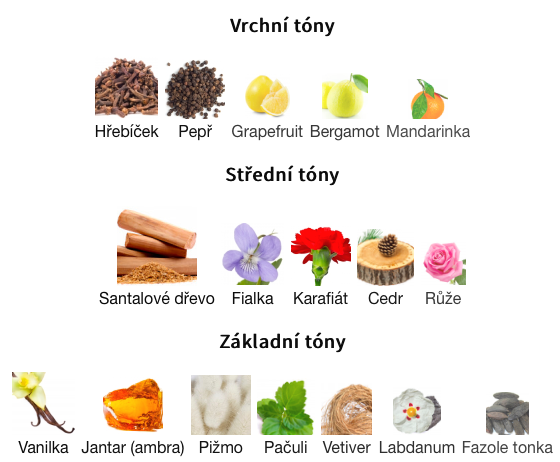 Střední tóny jsouSantalové dřevo, Fialka, Karafiát, Cedr a Růže