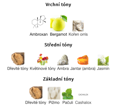 Vrchní tóny jsou Ambroxan, Bergamot a Kořen orris