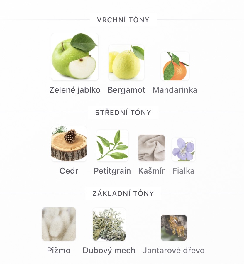 Střední tóny jsou Cedr, Petitgrain, Kašmír a Fialka ;