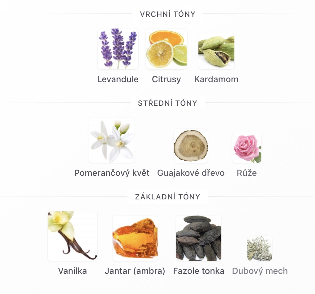 Vrchní tóny jsou Levandule, Citrusy a Kardamom;