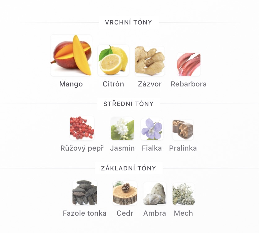 Vrchní tóny jsou Mango, Citrón, Zázvor a Rebarbora;