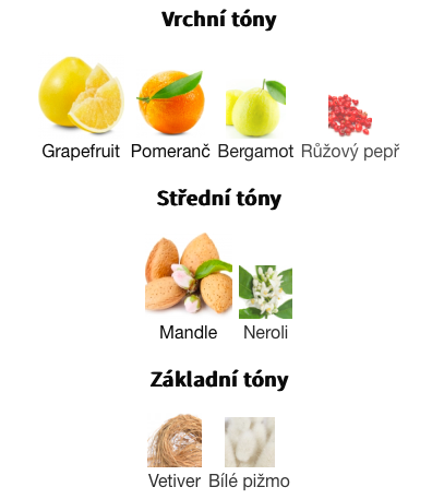 Vrchní tóny jsou Grapefruit, Pomeranč, Bergamot a Růžový pepř