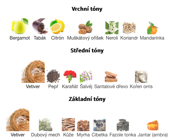 Základní tóny jsou Vetiver, Dubový mech, Kůže, Myrha, Cibetka, Fazole tonka a Jantar (ambra).