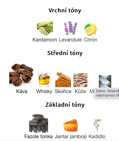 Základní tóny jsou Fazole tonka, Jantar (ambra) a Kadidlo.