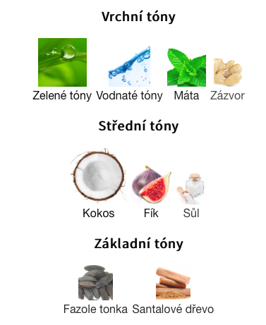 Vrchní tóny jsou Zelené tóny, Vodnaté tóny, Máta a Zázvor