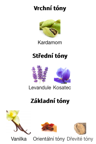 Základní tóny jsou Vanilka, Orientální tóny a Dřevité tóny.