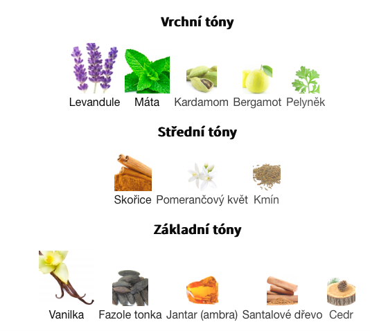 Vrchní tóny jsou Levandule, Máta, Kardamom, Bergamot a Pelyněk;