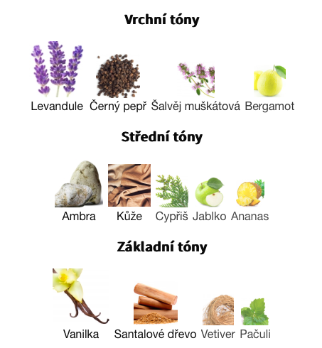 Vrchní tóny jsou Levandule, Černý pepř, Šalvěj muškátová a Bergamot
