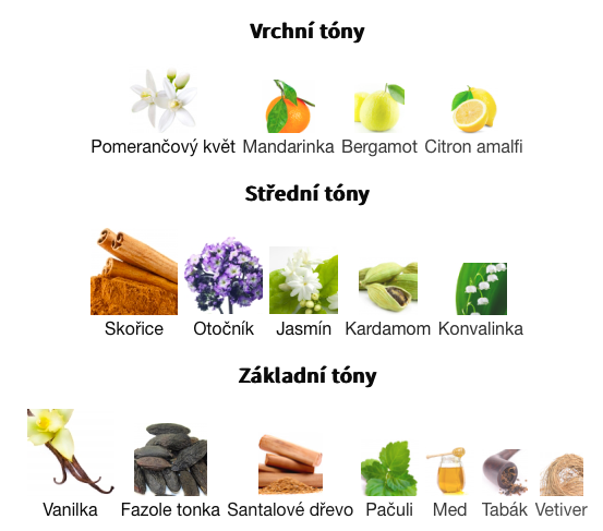 Vrchní tóny jsou Pomerančový květ, Mandarinka, Bergamot a Citron amalfi