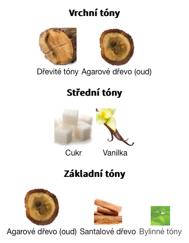 Vrchní tóny jsou Dřevité tóny a Agarové dřevo (oud)
