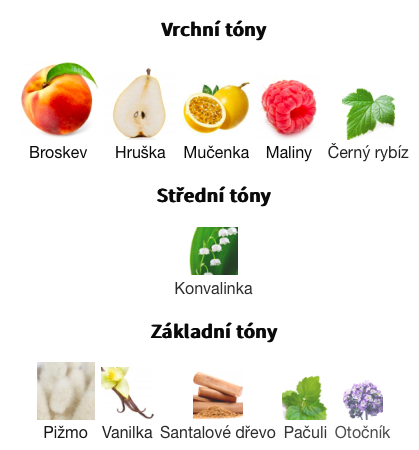 Vrchní tóny jsou Broskev, Hruška, Mučenka, Maliny a Černý rybíz