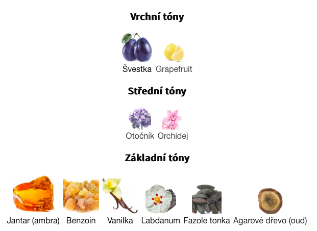 Základní tóny jsou Jantar (ambra), Benzoin, Vanilka, Labdanum, Fazole tonka a Agarové dřevo (oud).