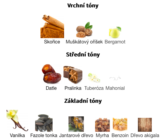 Základní tóny jsou Vanilka, Fazole tonka, Jantarové dřevo, Myrha, Benzoin a Dřevo akigala.
