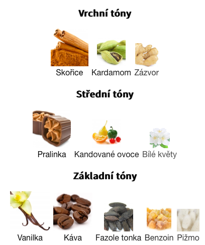 Základní tóny jsou Vanilka, Káva, Fazole tonka, Benzoin a Pižmo.