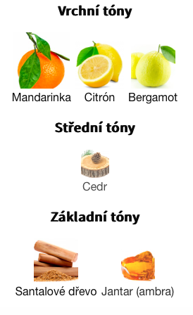Vrchní tóny jsou Mandarinka, Citrón a Bergamot