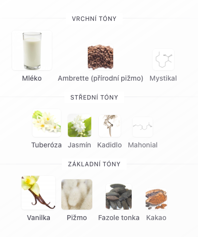 Základní tóny jsou Vanilka, Pižmo, Fazole tonka a Kakao.