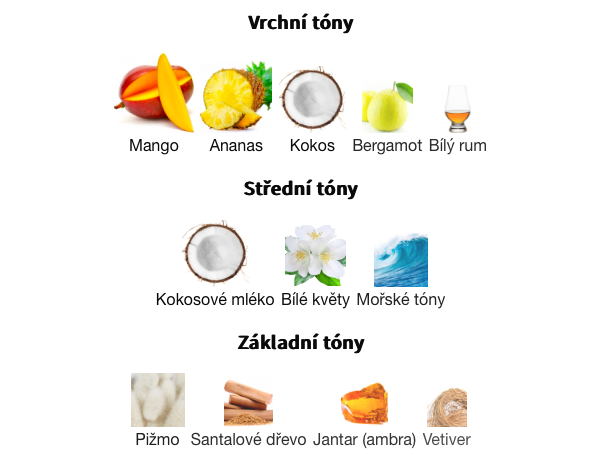 Vrchní tóny jsou Mango, Ananas, Kokos, Bergamot a Bílý rum;