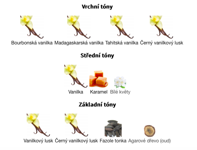 Vrchní tóny jsou Bourbonská vanilka, Madagaskarská vanilka, Tahitská vanilka a Černý vanilkový lusk;
