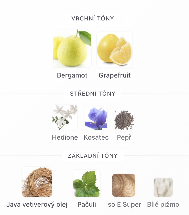 Střední tóny jsou Hedione, Kosatec a Pepř ;