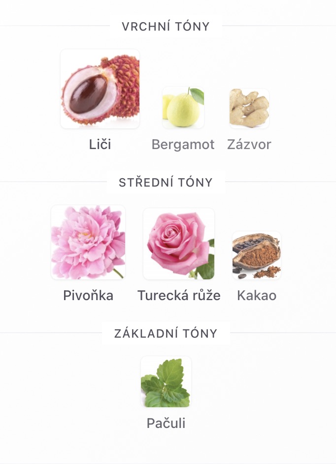 Střední tóny jsou Pivoňka, Turecká růže a Kakao ;