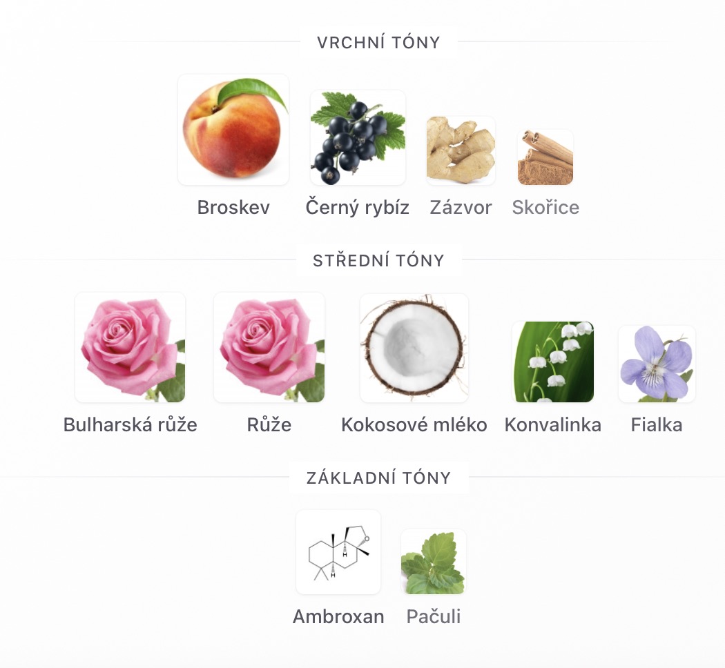 Střední tóny jsou Bulharská růže, Růže, Kokosové mléko, Konvalinka a Fialka ;