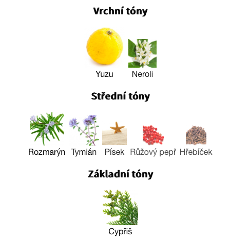Střední tóny jsou Rozmarýn, Tymián, Písek, Růžový pepř a Hřebíček
