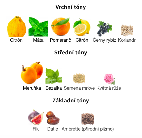Střední tóny jsouMeruňka, Bazalka, Semena mrkve a Květná růže ; základní tóny jsou Fík, Datle a Ambrette (přírodní pižmo).