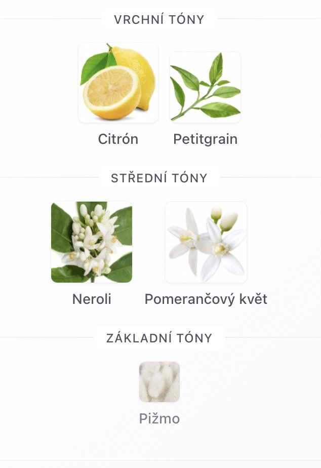 Střední tóny jsou Neroli a Pomerančový květ ;