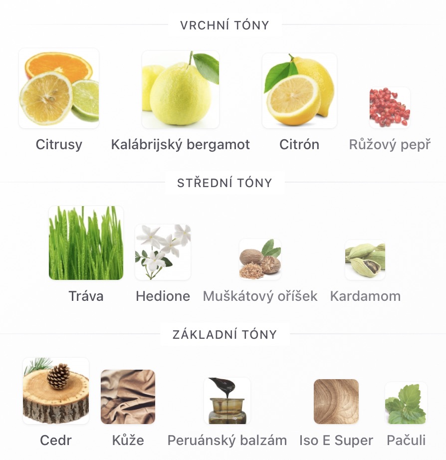 Střední tóny jsou Tráva, Hedione, Muškátový oříšek a Kardamom ;