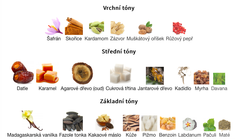 Střední tóny jsou Datle, Karamel, Agarové dřevo (oud), Cukrová třtina, Jantarové dřevo, Kadidlo, Myrha a Davana