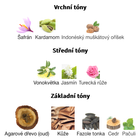 Vrchní tóny jsou Šafrán, Kardamom a Indonéský muškátový oříšek;